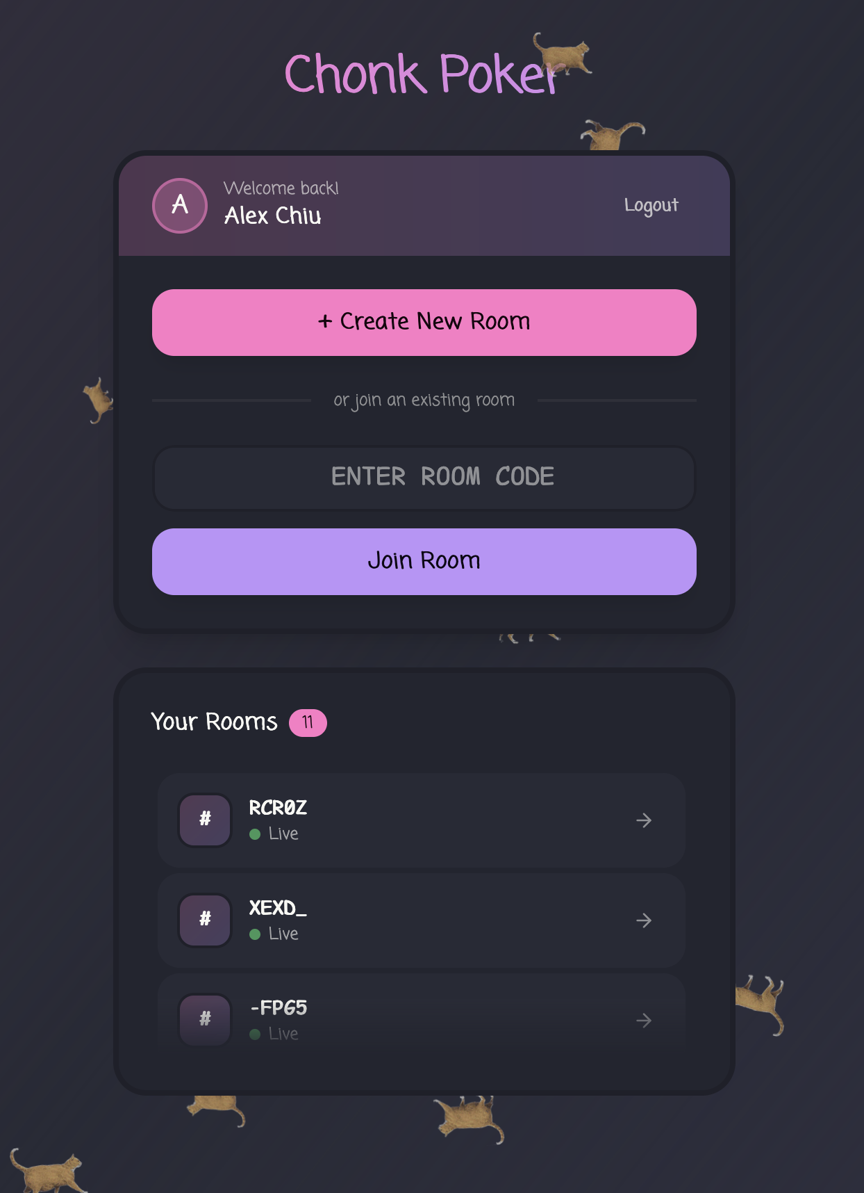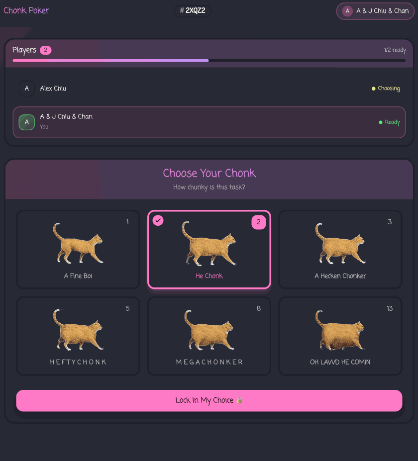 I built my new app chonk-poker. Its a planning poker game that uses the chonk scale. This is is how we size tickets at work now and its hilarious because every one keeps forgetting what size is what and the way we play planning poker is via a google meet chat, we count to three and post it at the same time. This stupid app is to make our planning session just a little bit smoother.